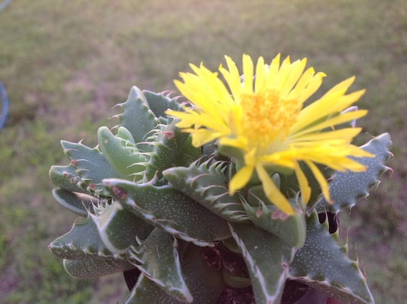 Faucaria tiger jaw blooms in fall to late winter and has a beautiful bright yellow flower, with thin petals reminiscent of a dandelion.